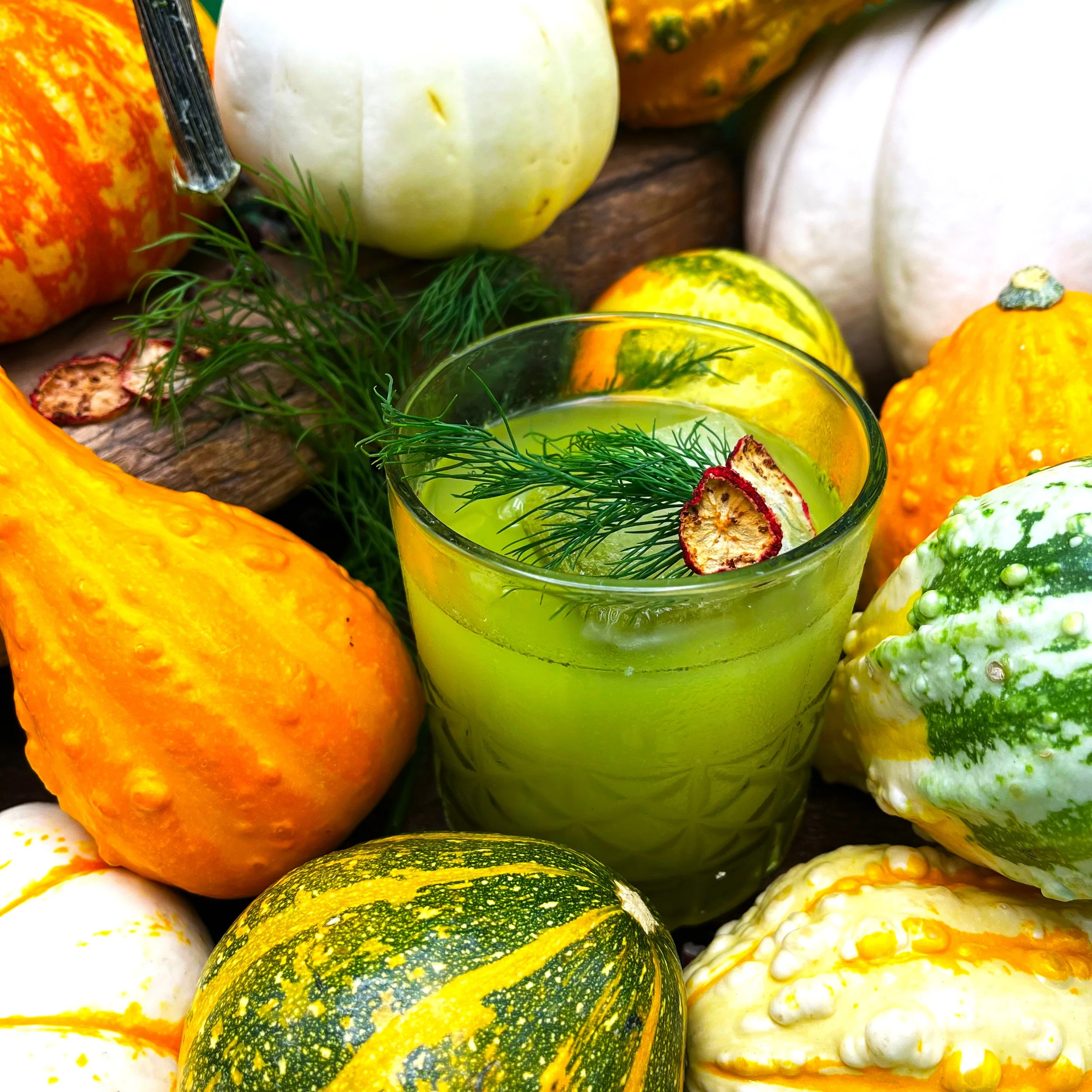 Dilly & dally with our Fins Sugarcane Vodka, fresh lime juice, simple syrup, snap pea purée, celery bitters, & a sprig of dill.